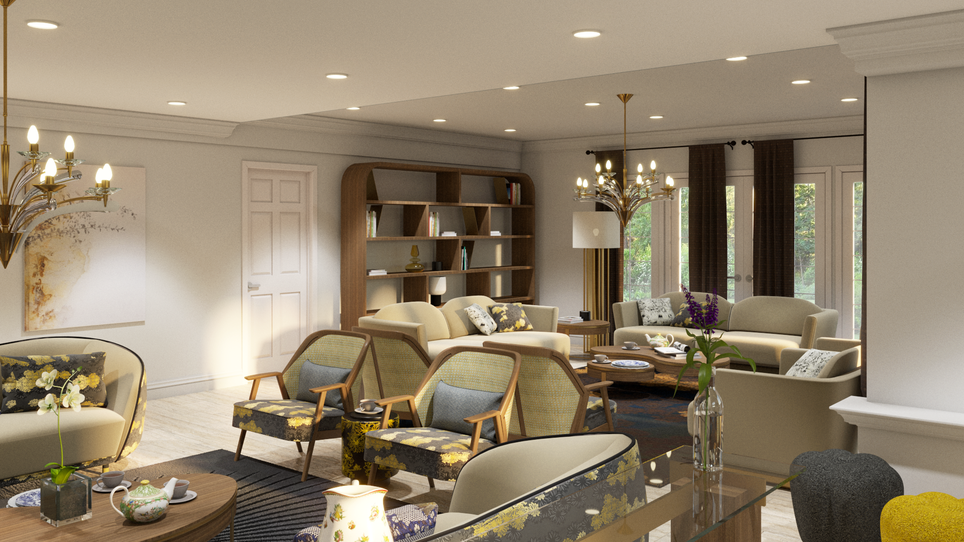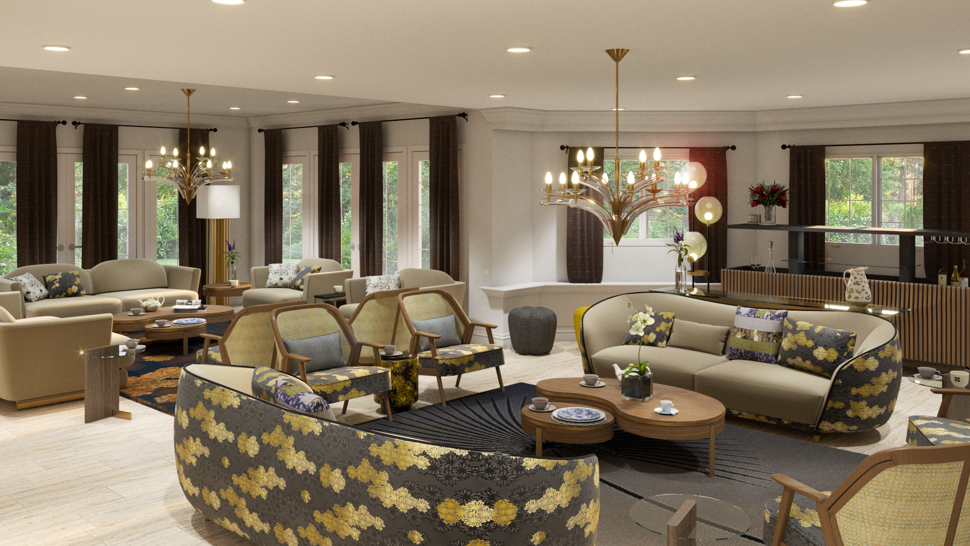 The client’s goal was to create a tea room in the basement for guests to come and gather. By using Roche Bobois pieces covered in interesting and ornate fabrics, the space becomes inviting and comforting, perfect for tea.